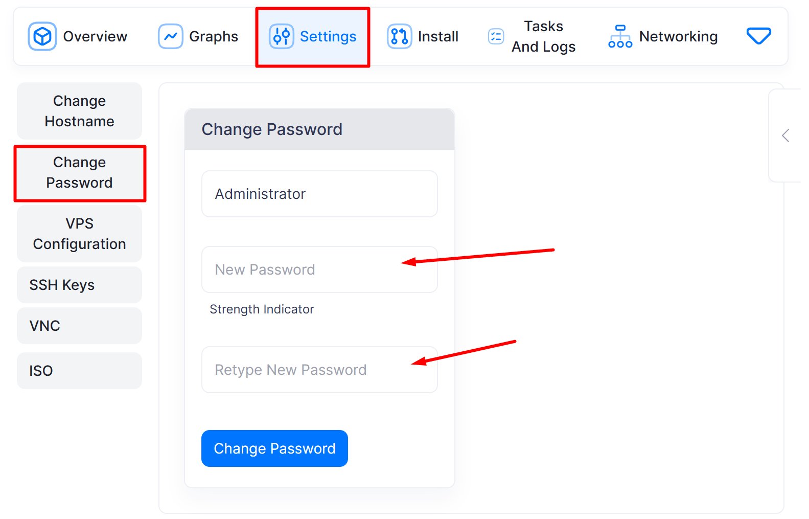 3. scroll down to see your VPS manager panel and select - Settings, Change Password